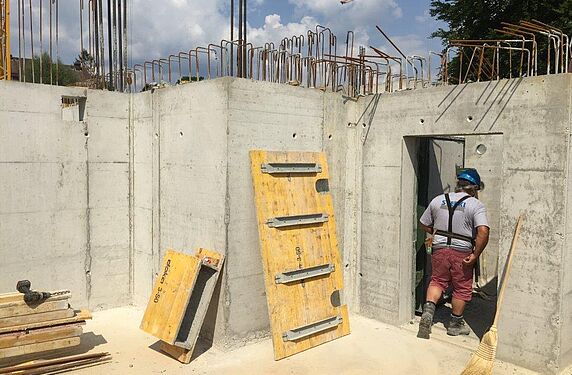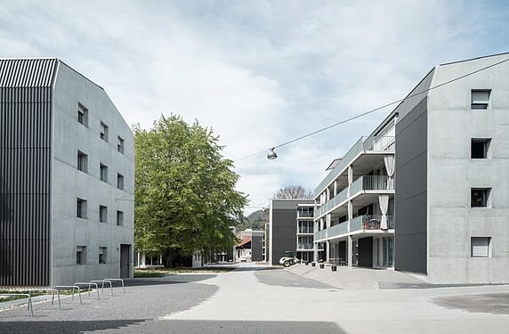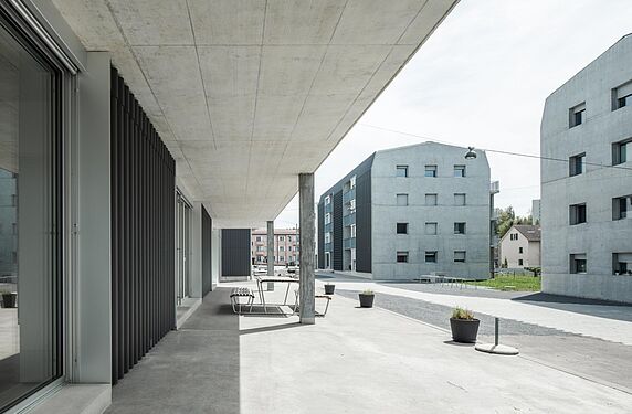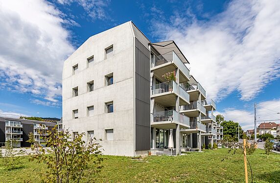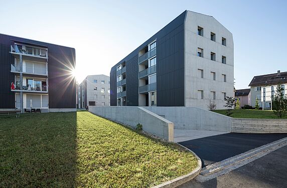 Die baugenossenschaftliche Siedlung au den 1950er Jahren in Mett einen Stadtteil von Biel, wurde durch Neubauten ersetzt. Total wurden 12 grosse Mehrfamilienhäusern mit einer sehr grossen Autoeinstellhalle und Kellerräumen gebaut. Die Sichtbetonfassade wurden immer vorgezogen. Das Tragkonstruckt innen bestand aus Mauerwerk und einer Einhäuptigen Betonschale gegen die Fassade. Die geneigten Dachflächen in Ortbeton wurden an die Sichtbetonfassaden angeschlossen. Anbauteile wie Treppenhaus und Balkone wurden mit den gleich hohen Sichtbetonansprüchen ausgeführt.